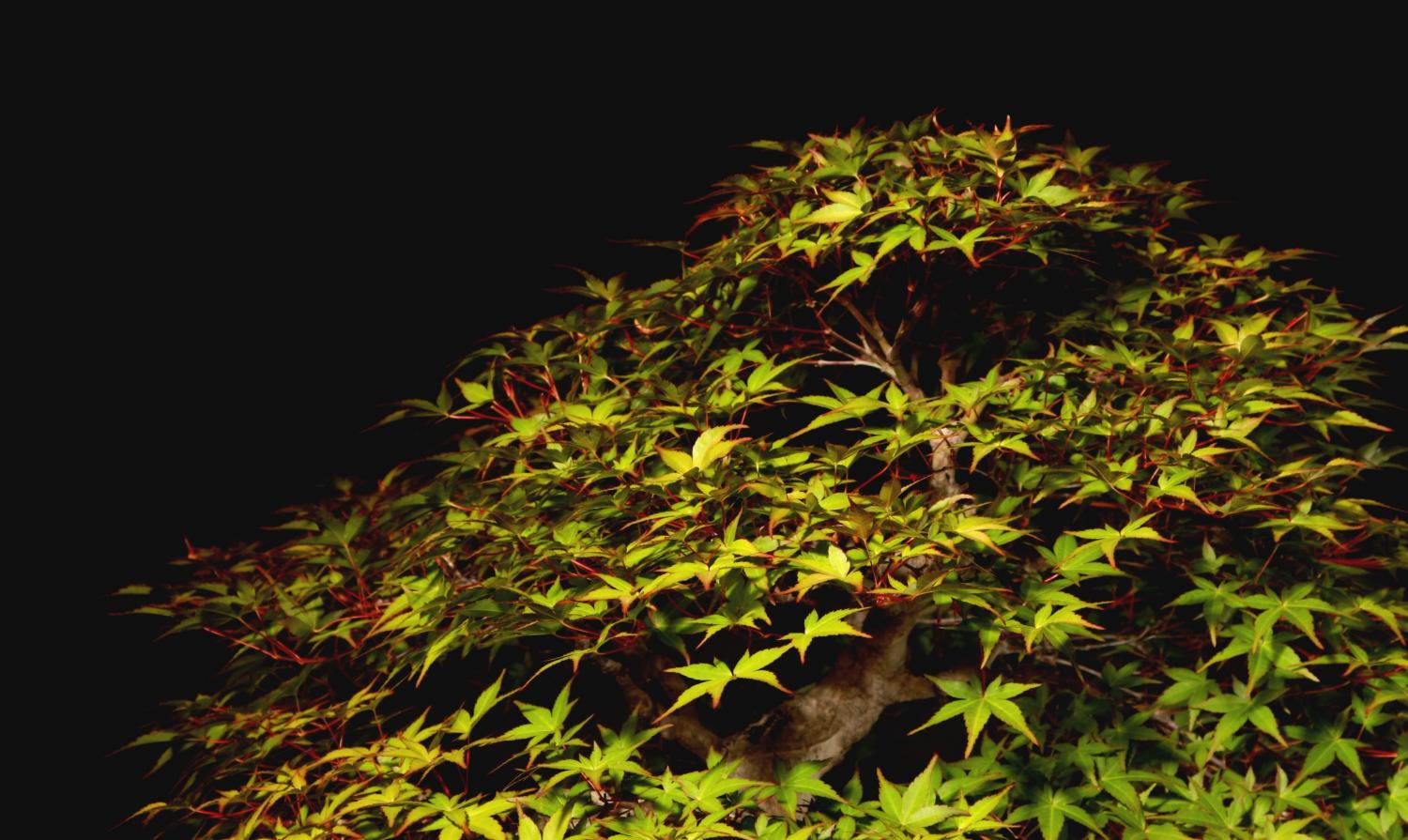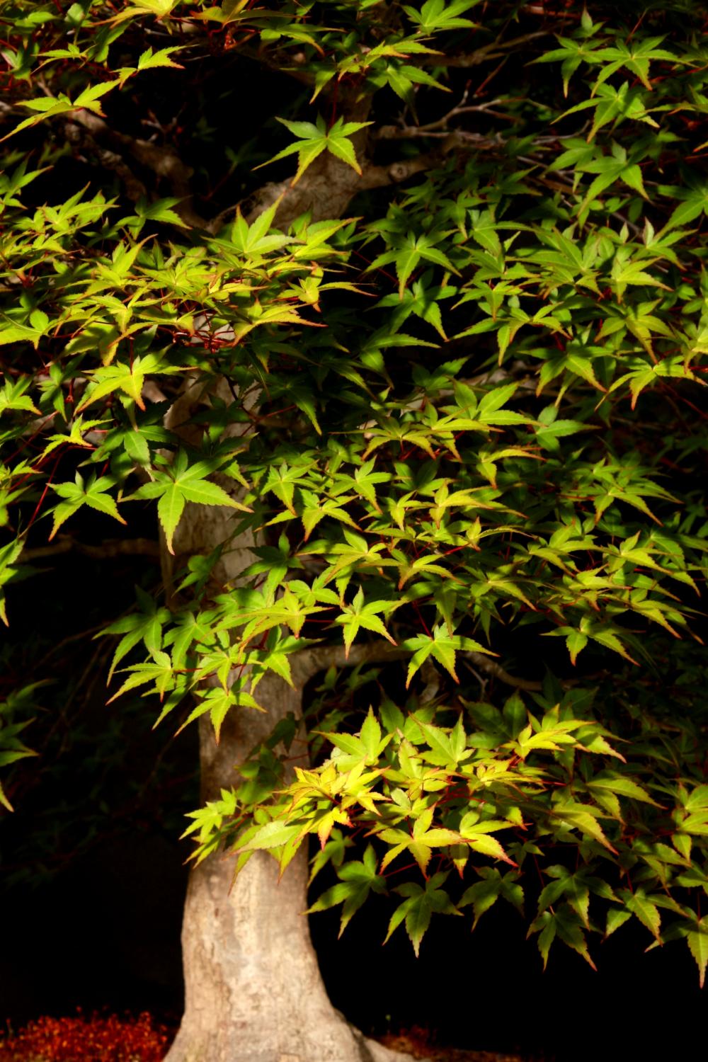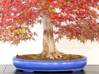 Acer palmatum (Japán juhar) 70 cm-es 'Beni Chidori' bonsai, aprólevelű, Japánban közkedvelt változat. Tavasszal sárgás-pirosan hajt ki, majd a nyár folyamán bezöldülnek a levelek, a szélükön továbbra is piros szegéllyel. A fehér törzs jelzi a fa korát, ugyanis a fajta ezt a fehér törzsszínt csak 20-30 éves korában éri el. Nagyon szép lehajló ágrendszerel. A kék fagyálló kínai minőségi tálat azért választottuk hozzá, mert egyrészt ez a tavaszi pirosas színeivel nagyon kontrasztos, másrészt a fehér törzshöz szintén szépen illik.
