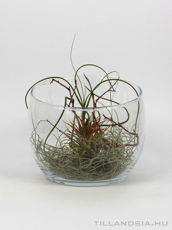 Három féle tillandsiából álló szoba dekoráció, mely 16cm Ø üveg edényben helyezhető el tetszőlegesen. A Tillandsia ionantha, baileyi és usneoides egy naturális faággal egészül ki - gazdagítva a berendezés lehetőségeit. Az airplant kompozíció kellemes és dekoratív pontja lehet otthonunknak, nappalinknak, étkezőnknek, vagy akár fürdőszobánknak vagy konyhánknak. Kitűnő ajándék lehet bármilyen alkalomra.