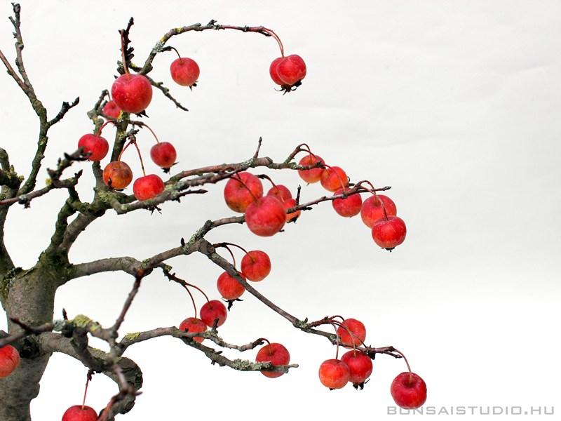 A Malus halliana vagy Díszalma, az egyik legkedveltebb virágzó és látványos termést hozó bonsai alapanyag. Ez a mázas kerek bonsai tálba ültetett, mozgalmas törzsű Díszalma bonsai, két - három év alatt kiállításkész bonsai fává alakítható.