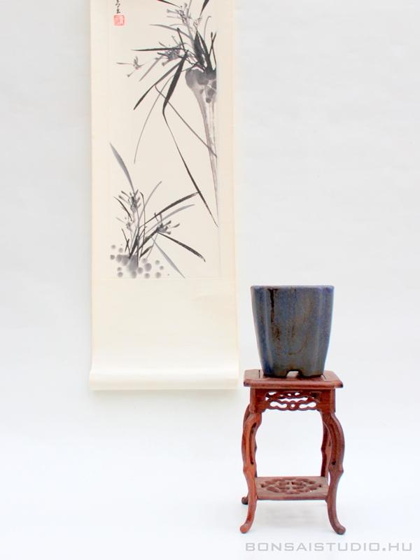 Bonsai kiegészítő szett, mely a beltéri bonsaiok lakásban történő esztétikus elhelyezéséhez vagy bonsai kiállításra felkészítésére használható. A szett tartalmaz egy egyedi kék mázas bonsai tálat (10 x 10 x 11cm), egy bonsai asztalt (11,5 x 11,5 x 17,5cm) és egy kiakasztható tekercsképet (100 x 23cm).
