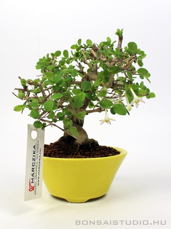 Shohin méretű lonc bonsai sárga mázas japán shohin bonsai tálban. Egyszerűen tartható kiállítás érett fehér virágot hozó növény, mely viszonylag gyorsan növekszik. Síma vöröses sárga kérgezetű, lombja tavasszal élénkzöld hajtásokkal indul meg.